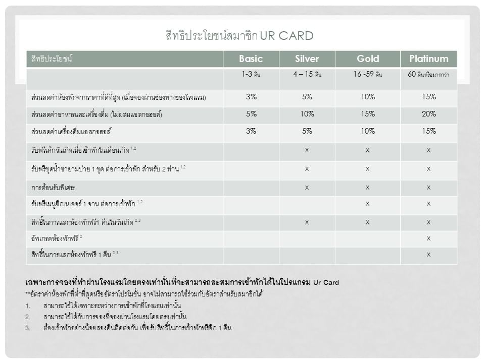ยู โฮเต็ลแอนด์รีสอร์ท ขอมอบข้อเสนอสุดพิเศษ สำหรับสมาชิก Ur Card Programme เท่านั้น เมื่อคุณจองผ่านเว็บไซต์โรงแรมอย่างเป็นทางการของเรา สิทธิประโยชน์จะเพิ่มขึ้นตามจำนวนคืนที่เข้าพักที่ ยู โฮเต็ลแอนด์รีสอร์ท ของเราทั่วโลก