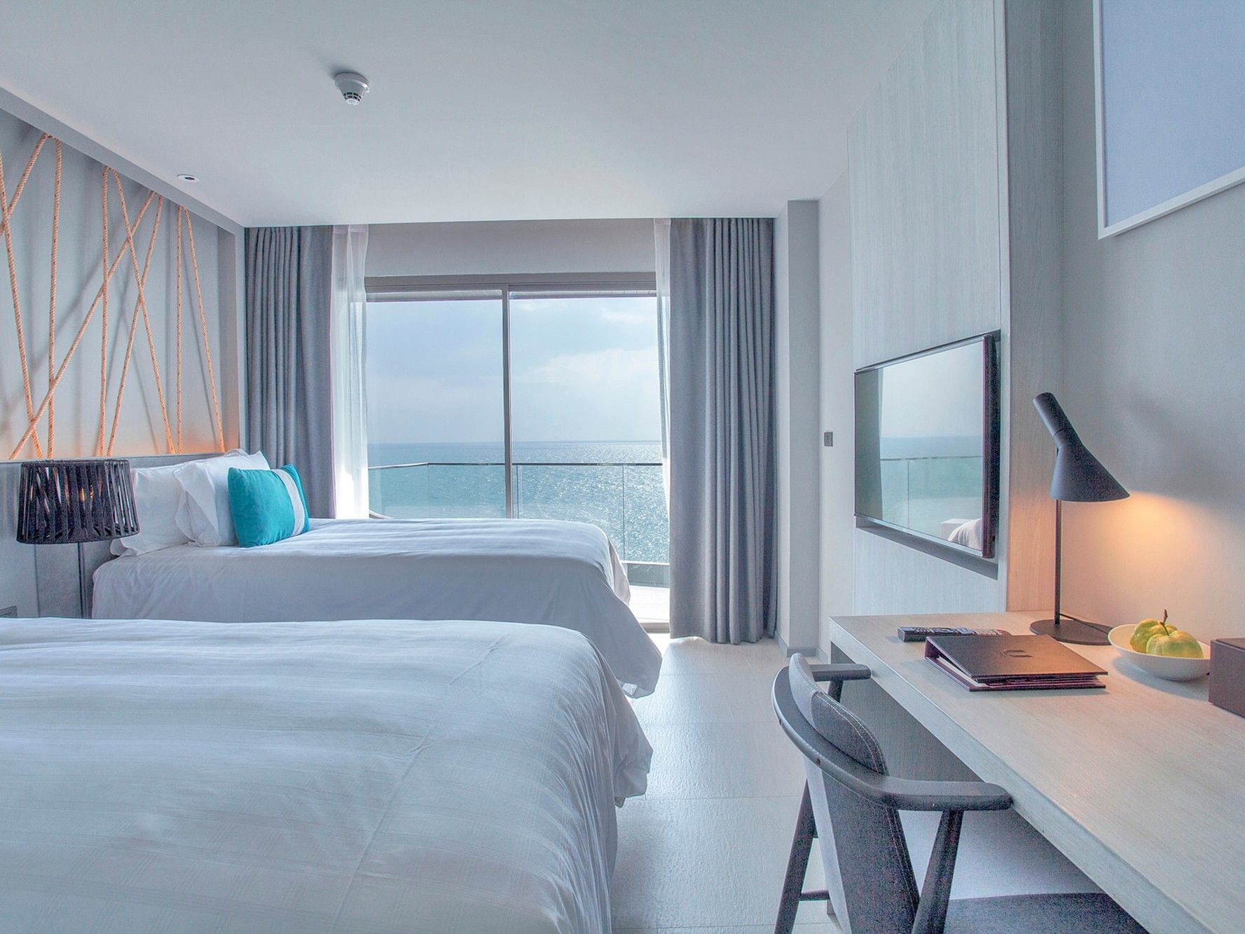 U Jomtien Pattaya’s Superior Seaview Rooms feature ceiling-to-floor windows and a spacious balcony with views of the sea.